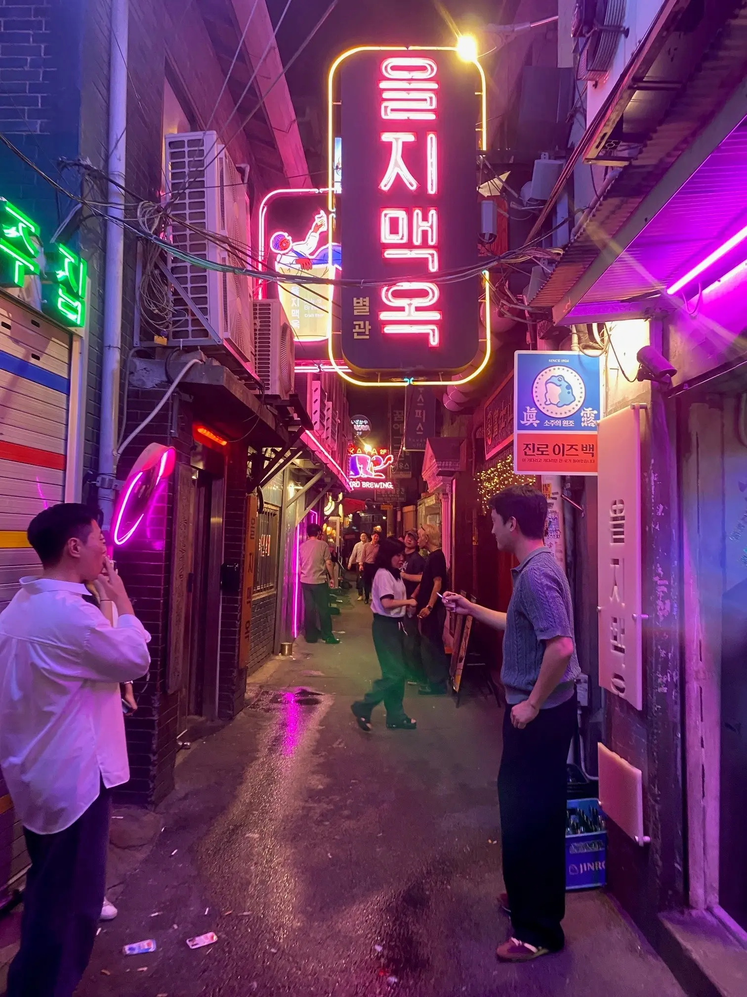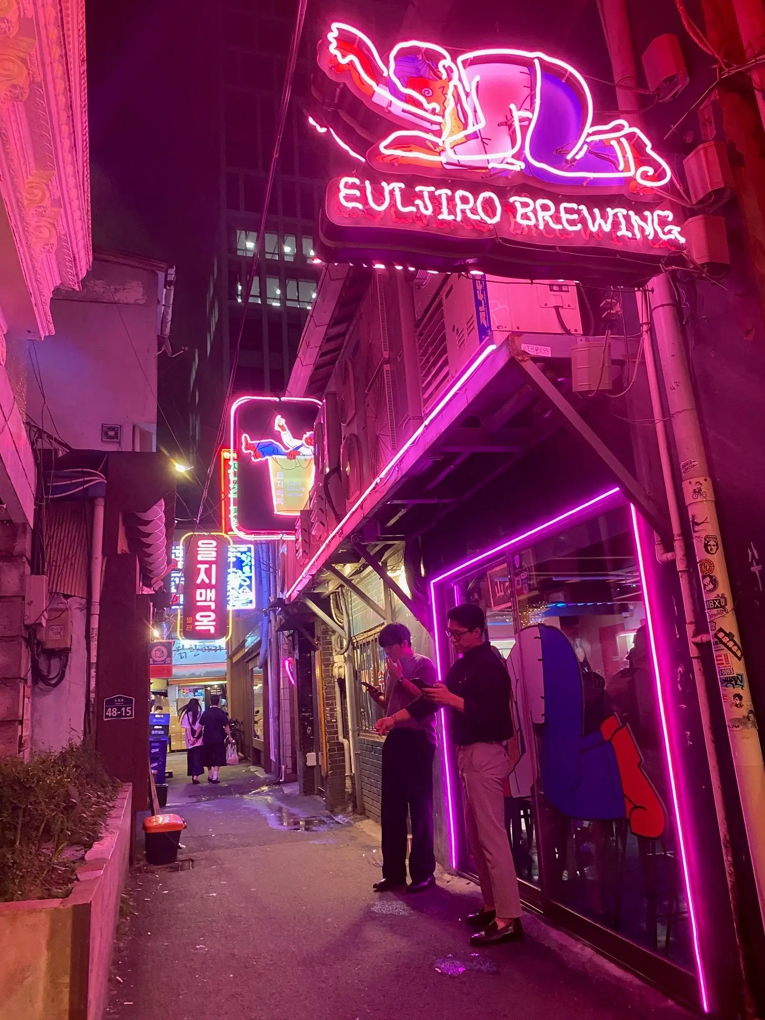 För den som gillar neonlysande barer är Euljiro 3 ett måste. Här finns den gömda baren The Ranch Brewing, som ligger dold bakom en maskin som ser ut som en vending machine. Väl inne väntar riktigt goda kycklingvingar och ölprovningar – och såklart kan man testa koreanska klassikern Chicken & Beer eller blanda soju & öl, vilket är mycket godare än det låter.